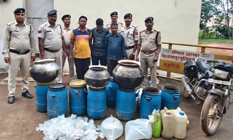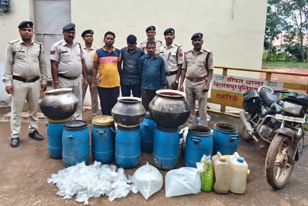 ख़बर 36 गढ़ न्यूज़ सीपत : शुक्रवार को ग्रामीणों ने सीपत पुलिस को मोबाईल फोन से सूचना दिए कि ग्राम खैरा(लगरा) में भारी मात्रा में अवैध कच्ची महुआ शराब बनाने व बिक्री करने की सूचना दी जंहा सीपत थाना प्रभारी निरीक्षक गोपाल सतपथी के द्वारा सीपत पुलिस की टीम तैयार कर ग्राम खैरा(लगरा) में रेड कार्यवाही किया गया जहां 1. शंकर केंवट पिता भगत राम केंवट उम्र 32 साल निवासी खैरा लगरा (15 लीटर) 2. दिलीप कुमार साहू पिता लक्ष्मण साहू उम्र 49 साल निवासी खैरा लगरा (15 लीटर) 3. गणेश प्रसाद धुरी पिता रामचंद्र धुरी उम्र 37 साल निवासी लगरा थाना सरकंडा (27.5 लीटर एवं मोटर सायकल क्रमांक सीजी 10 एएफ 9977) से कुल 57.5 लीटर कच्ची महुआ शराब को जप्त कर सभी आरोपियों के विरुद्ध आबकारी एक्ट की धारा 34(1)(क)(च),34 (2), 59क के तहत् कार्यवाही कर गिरफ्तार कर न्यायिक रिमांड पर जेल भेजा गया है।