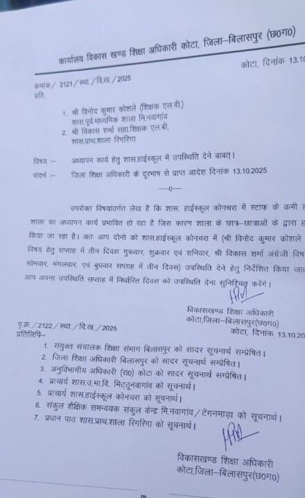 धरना स्थल पर बड़ी संख्या में ग्रामीण, छात्र-छात्राएं और अभिभावक शामिल हुए। छत्तीसगढ़िया क्रांति सेना के पदाधिकारियों ने कहा कि शिक्षा हर बच्चे का अधिकार है और प्रशासन की लापरवाही बर्दाश्त नहीं की जाएगी।