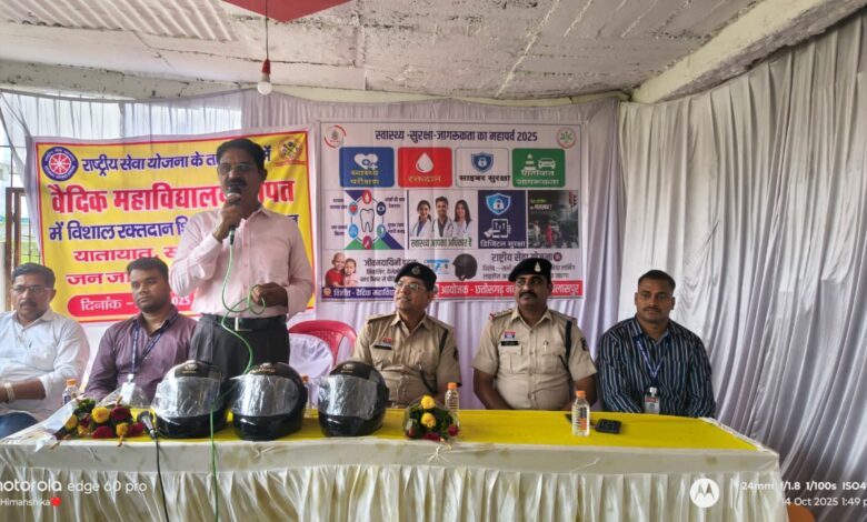 ख़बर 36 गढ़ न्यूज़ सीपत :– वैदिक महाविद्यालय, सीपत के रासेयो इकाई एवं सामाजिक संस्था के संयुक्त तत्वाधान में एक भव्य स्वैच्छिक रक्तदान एवं जनजागरूकता कार्यक्रम का आयोजन किया गया। इस आयोजन में विद्यार्थियों से लेकर ग्रामीणों तक ने बढ़चढ़कर हिस्सा लिया और दूसरों की जान बचाने के लिए 70 यूनिट रक्तदान किया। शिविर में स्वास्थ्य जांच, यातायात एवं साइबर सुरक्षा संबंधी जागरूकता कार्यक्रम भी आयोजित हुआ। इस अवसर पर अतिथि के रूप में जिला पंचायत सदस्य राजेंद्र धीवर, सीपत भाजपा मंडल अध्यक्ष दीपक शर्मा, सीपत प्रेस क्लब अध्यक्ष प्रदीप पांडेय, सीपत-बेलतरा इकाई श्रमजीवी पत्रकार संघ अध्यक्ष हरीश गुप्ता, लक्ष्मी साहू, यातायात एडिशनल एसपी रामगोपाल करियारे, ट्रैफिक मास्टर ट्रेनर उमाशंकर पांडेय, टीआई गोपाल सतपथी, साइबर एक्सपर्ट सतीश भारद्वाज, राघवेंद्र साहू, शत्रुघ्न धृतलहरे, एवं शैलू श्रीवास सहित उपस्थित रहे। यातायात एडिशनल एसपी रामगोपाल करियारे ने कहा कि यातायात की सावधानियां जीवन से जुड़ी होती हैं। युवा यदि आत्मविश्लेषण की भावना से काम करें तो समाज में अपराध और दुर्घटनाएं दोनों कम होंगी। आप पुलिस के आंख और कान हैं, हमारे सहयोगी हैं। नशे में वाहन चलाना और बिना हेलमेट चलाना आत्मघाती कदम है। सावधानी ही जीवन रक्षा का सबसे बड़ा उपाय है। ट्रैफिक मास्टर ट्रेनर उमाशंकर पांडेय ने कहा कि रक्तदान नहीं बल्कि जीवनदान दे रहे हैं आप सभी। यह मानवता की सबसे बड़ी सेवा है। दोपहिया वाहन सुविधाजनक जरूर हैं, लेकिन लापरवाही से ये जानलेवा भी बन जाते हैं। साथ ही मवेशियों को सड़कों पर न छोड़ें, यह भी दुर्घटनाओं का प्रमुख कारण है। टीआई गोपाल सतपथी ने कहा कि नियमों का पालन करना केवल कानून का पालन नहीं, बल्कि परिवार के प्रति जिम्मेदारी है। हर व्यक्ति को यातायात नियमों को अपनी दिनचर्या का हिस्सा बनाना चाहिए। सड़क पर आपका अनुशासन ही किसी का जीवन बचा सकता है। जिपं सदस्य राजेंद्र धीवर ने कहा कि ऐसे आयोजन युवाओं में समाजसेवा की भावना जगाते हैं। रक्तदान जैसे कार्य समाज में इंसानियत की मिसाल पेश करते हैं। मैं वैदिक महाविद्यालय परिवार और सभी विद्यार्थियों को बधाई देता हूँ जिन्होंने इसे सफल बनाया। सीपत भाजपा मंडल अध्यक्ष दीपक शर्मा ने कहा कि युवा देश की ताकत हैं और आज उन्हें देखकर गर्व महसूस होता है कि वे न सिर्फ अपनी पढ़ाई में बल्कि समाज के हित में भी आगे आ रहे हैं। रक्तदान जैसी पुण्य पहल हर युवा को करनी चाहिए। शिविर में आयुर्वेद चिकित्सा अधिकारी डॉ. अरुण गौतम, नेत्र विशेषज्ञ, दंत चिकित्सक और श्री श्याम मल्टीस्पेशलिटी एवं सुपर स्पेशलिटी हॉस्पिटल की टीम ने अपनी सेवाएं दीं। बड़ी संख्या में ग्रामीणों और विद्य