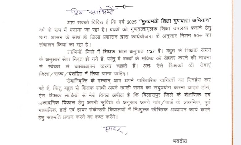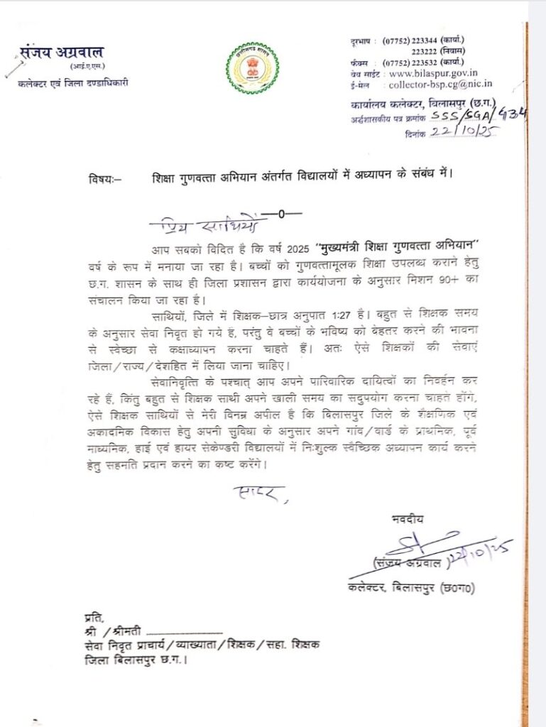 ख़बर 36 गढ़ न्यूज़ बिलासपुर, 22 अक्टूबर 2025/ जिले के विद्यालयों से सेवानिवृत्त हो चुके प्राचार्य, व्याख्याता एवं शिक्षक अब विद्यालयों में बच्चों को निःशुल्क पढ़ाएंगे। यह शैक्षिक अध्यापन कार्य पूर्णता निशुल्क होगा तथा सत्र के अंत में जिला प्रशासन के द्वारा इन शिक्षकों को सम्मानित करते हुए कलेक्टर द्वारा प्रशस्ति पत्र भी प्रदान किया जाएगा। शिक्षा गुणवत्ता अभियान के क्षेत्र में अभिनव पहल करते हुए कलेक्टर श्री संजय अग्रवाल ने विगत कुछ वर्षाें में सेवानिवृत्त हुए प्राचार्य, व्याख्याता, शिक्षकों एवं सहायक शिक्षकों से अपील की है कि जो शिक्षक सेवानिवृत्ति के उपरांत भी अपने पारिवारिक दायित्वों का निर्वहन करते हुए जिले में शिक्षा का अलख जगाने के लिए कक्षा अध्यापन करना चाहते हैं, वे स्वैच्छिक कक्षाध्यापन कर सकते है।