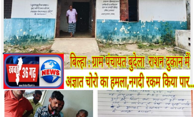 बिल्हा : ग्राम पंचायत बुदेला  राशन दुकान में अज्ञात चोरो का हमला,नगदी रकम किया पार… ? Khabar 36 Garh is News bilaspur