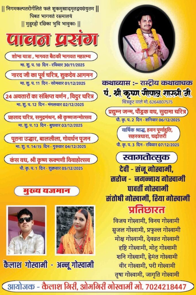 गोस्वामी परिवार की ममता मई मां स्वर्गीय श्रीमती कुंती देवी गोस्वामी की वार्षिक श्राद्ध में चित्रकूट के कथा वाचक पंडित श्री कृष्ण गोपाल शास्त्री जी होंगे वेदव्यास