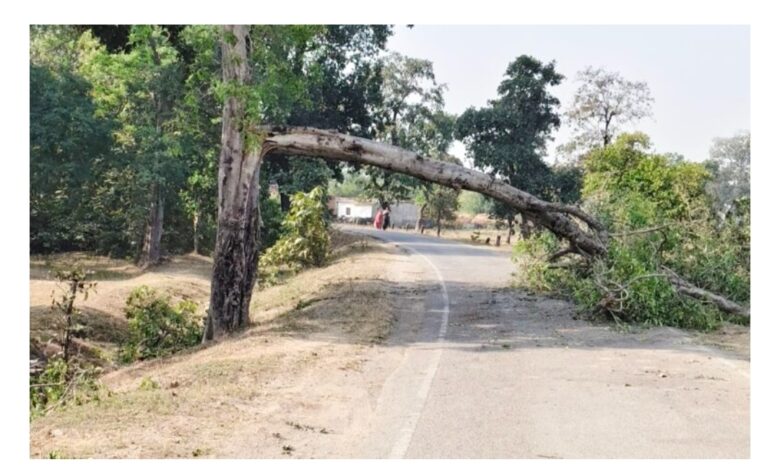 अदराली के पास मुख्य सड़क पर झुका पेड़— हरदीबाजार कोरबा -सीपत बिलासपुर मार्ग के यात्रियों को परेशानियाँ बढ़ीं