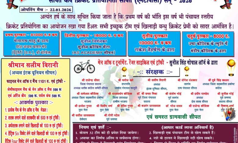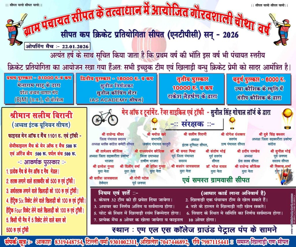 सीपत क्रिकेट प्रतियोगिता का आयोजन 22 जनवरी से,,,इनामों की बौछार ? Khabar 36 Garh is news bilaspur chhattisgarh